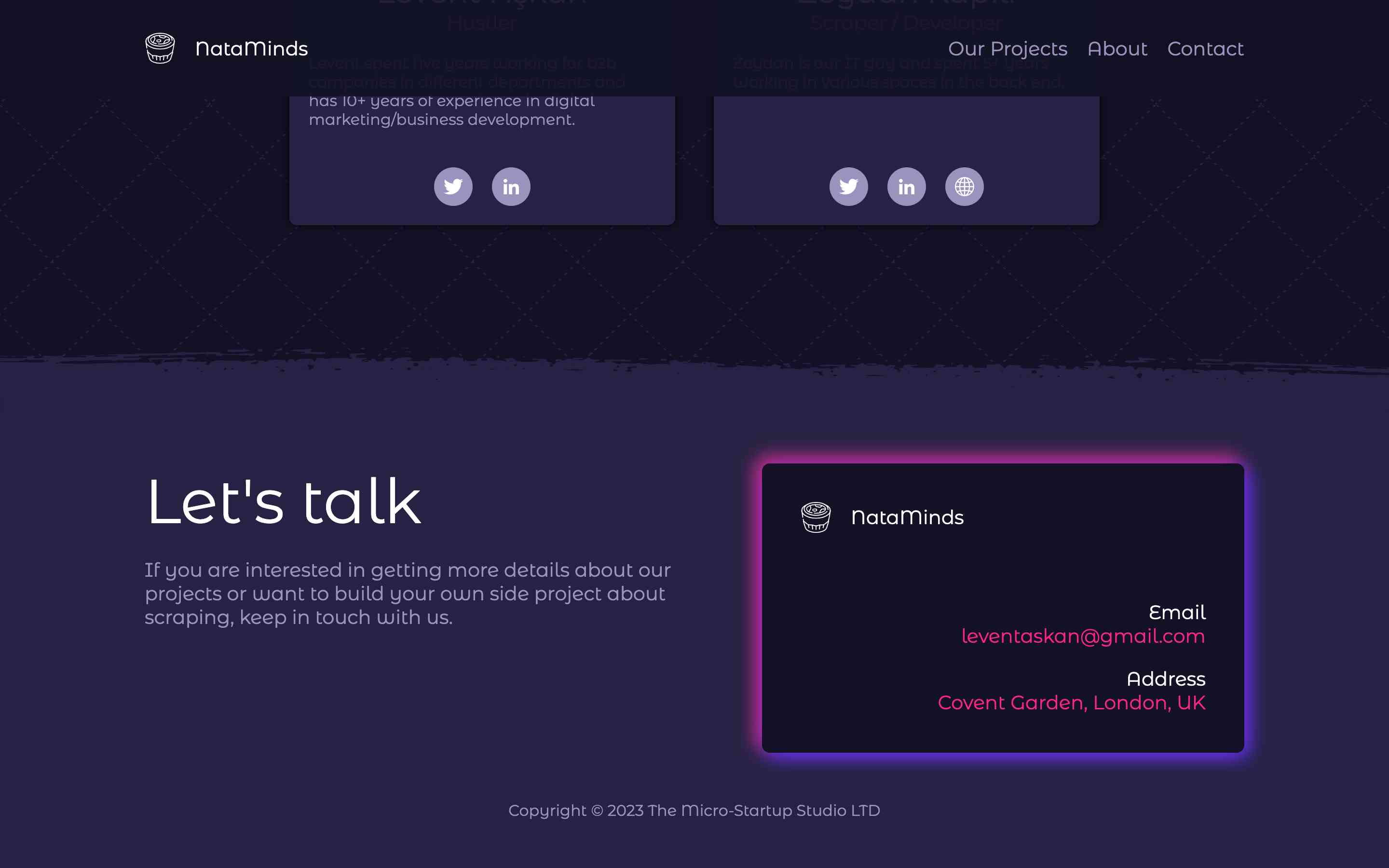 To help increase its visibility, we created a single page for NataMinds. This page features a unique scrolling effect that adds a touch of creativity and showcases the company's innovative spirit. In addition to this, the page is divided into three sections that provide valuable information about the company. The "Our Project" section highlights the various projects that the company is working on and gives users a glimpse of what they can expect in the future. The "About Us" section introduces the team behind NataMinds and provides insight into their background and experience. Finally, the "Contact" section makes it easy for potential clients or partners to get in touch with the company.