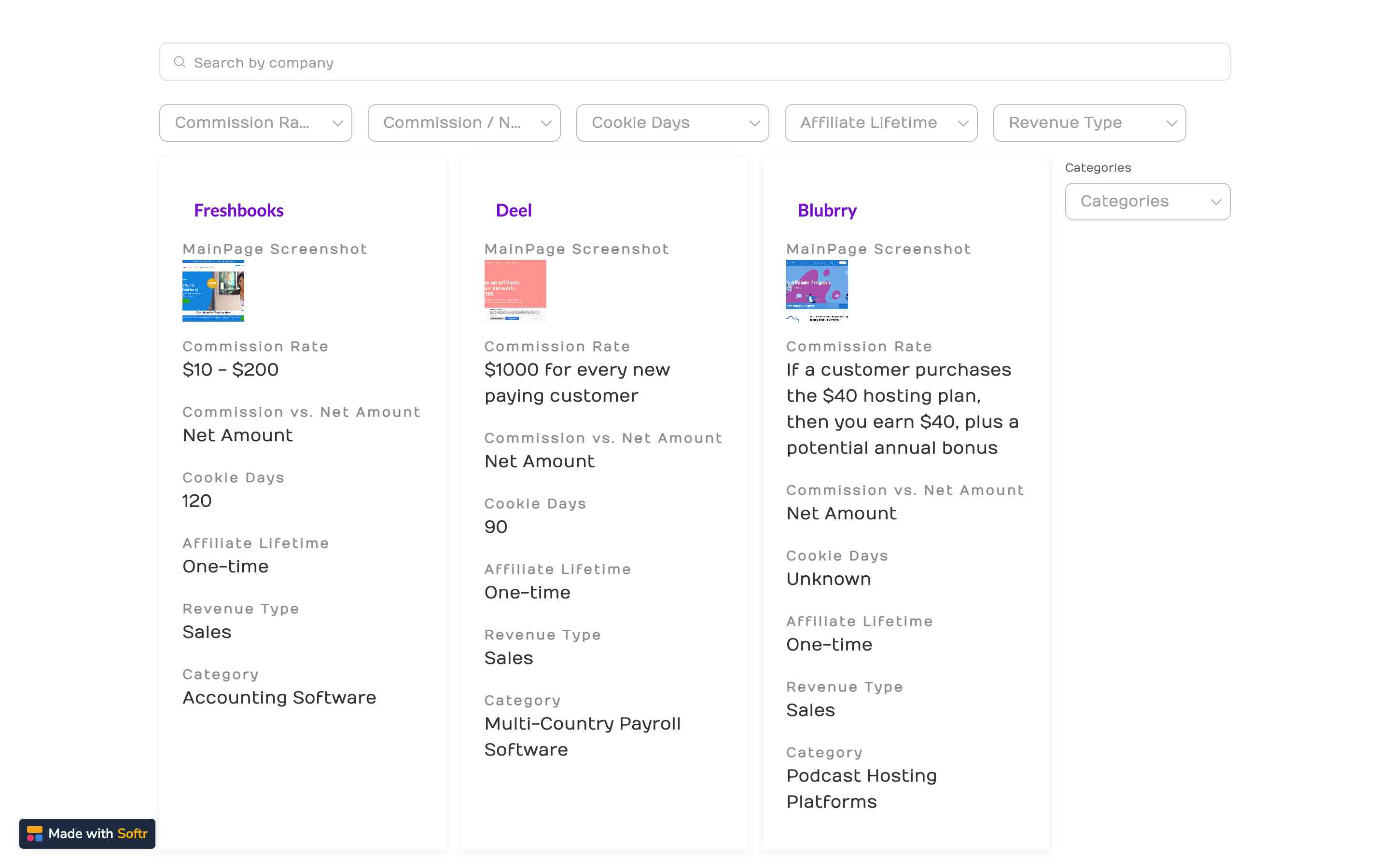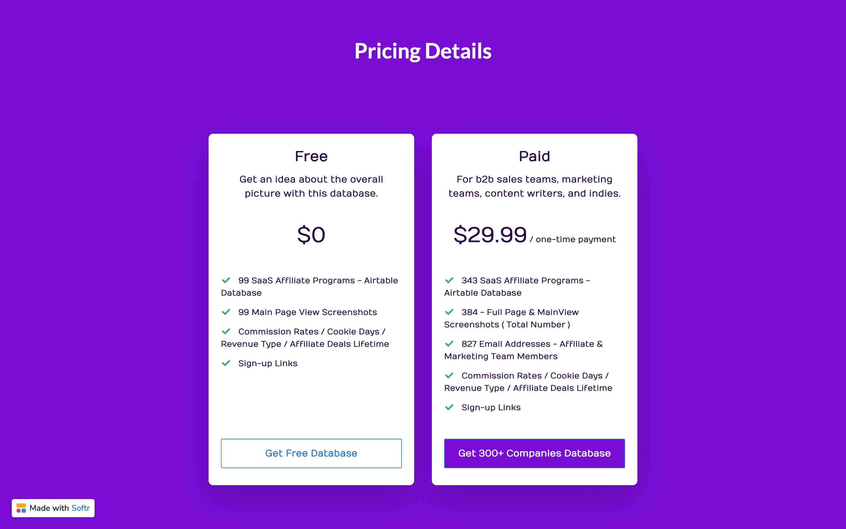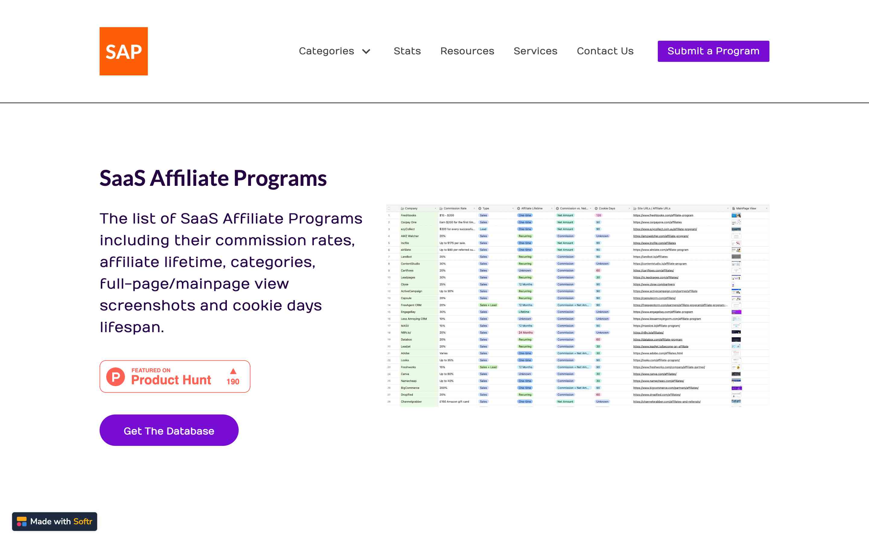 SaaS Affiliate Programs is a web platform that lists affiliate programs belonging to companies operating in the SaaS industry, as the name implies. The free version provides a wealth of information, such as commission rates and cookie durations, for these companies. In the paid version, users can access even more company details, including contact information for employees in relevant departments.