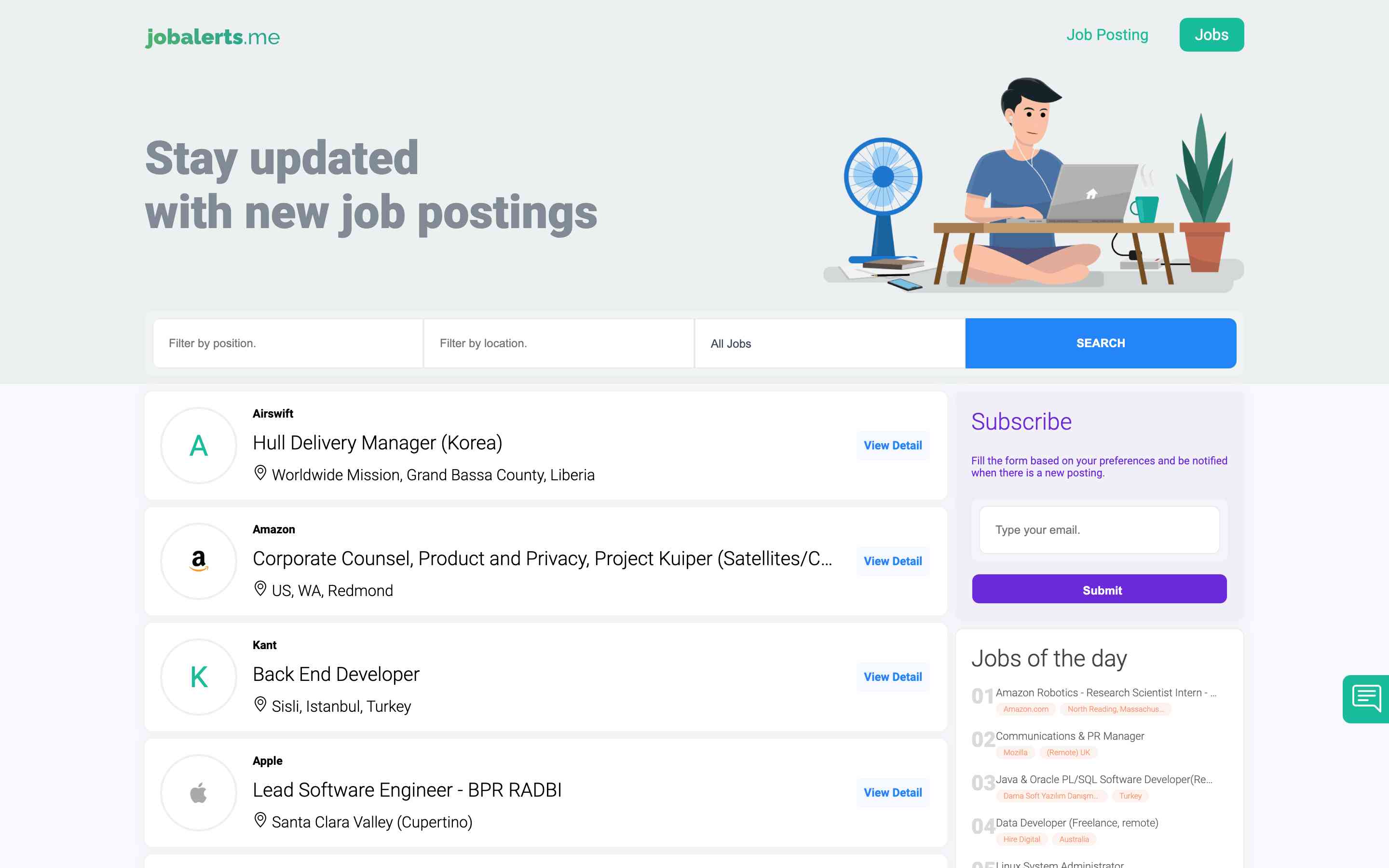 One of the unique features of jobalerts.me is its subscription options. Users can choose to receive filtered job postings via email, based on their preferred location, position, job type, and email frequency (daily or weekly). This feature ensures that users receive only job postings that match their criteria, thereby saving them time in their job search.